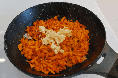 Выложить морковь. Обжаривать на сильном огне 2–3 минуты.