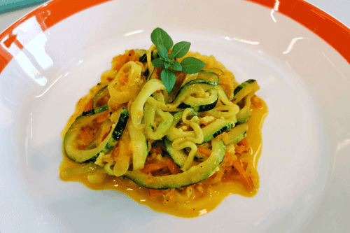Паста из кабачка — это легкое, изысканное блюдо русской кухни, которое сочетает в себе нежность овощей и яркие восточные специи. Основа этой пасты — кабачок, нарезанный тонкими полосками, напоминающими лапшу, а морковь придает ей легкую сладость. Чеснок и куркума наполняют блюдо пряным ароматом, а кокосовые сливки создают нежную кремовую текстуру. Это идеальный вариант для тех, кто ищет здоровую альтернативу классической пасте, при этом сохраняя насыщенный вкус. Благодаря легкости ингредиентов, паста из кабачка отлично подойдет как для летнего ужина, так и для детского питания. Подайте её с зеленью и свежими овощами, чтобы подчеркнуть её естественную свежесть и вкусовую гармонию.