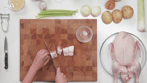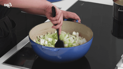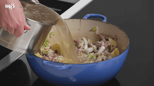 Разогреть оставшийся утиный жир в кастрюле на среднем огне. Обжарить лук, лук-порей и сельдерей до мягкости.
