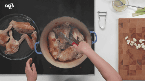 В большой жаропрочной кастрюле растопить половину утиного жира и бросить туда утку и бекон. Обжаривать до золотистой корочки, добавить зубчики чеснока и жарить еще 1–2 минуты.