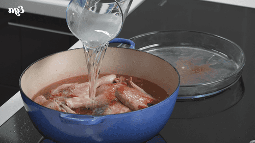 Влить воду, довести до кипения и тушить под крышкой на слабом огне около 2 часов.