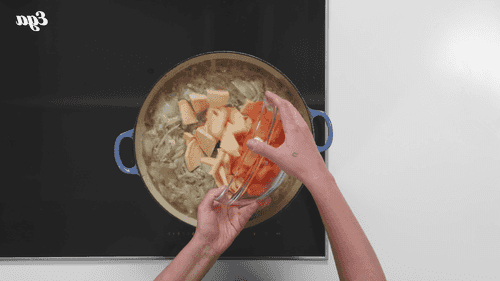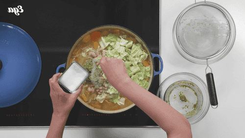 Добавить получившееся пюре в кастрюлю, а также добавить капусту и фасоль, предварительно слив из нее жидкость. Посолить и поперчить, перемешать и тушить еще 5–7 минут.