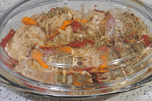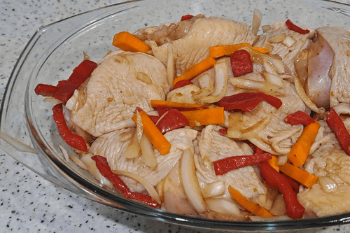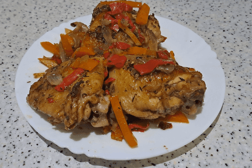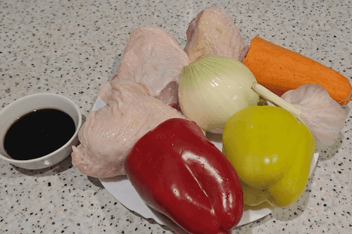 Тушеные куриные бедра в соевом соусе с овощами в духовке