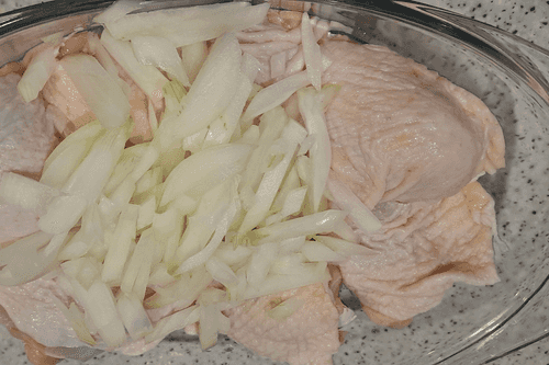 Лук очистить, хорошо вымыть, нарезать крупной соломкой или кубиком, выложить в форму к куриным бедрам.