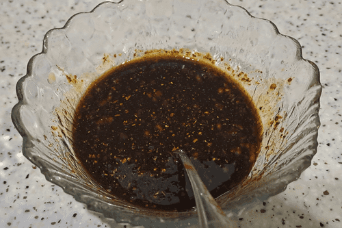 В отдельную емкость влить 100 мл соевого соуса, добавить к соусу 1 чайную ложку соли и 1 чайную ложку смеси молотых перцев.