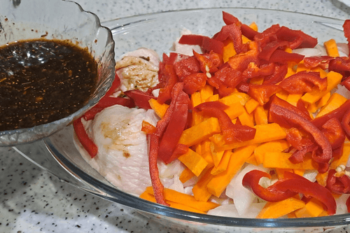 Влить в форму к куриным бедрам и овощам подготовленный соевый соус.