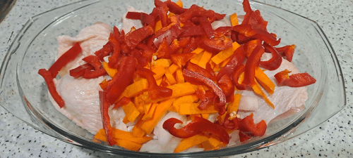 Сладкий красный болгарский перец очистить от семян и ножек, хорошо вымыть под проточной водой, нарезать крупной соломкой или кубиком и выложить в форму к овощам.