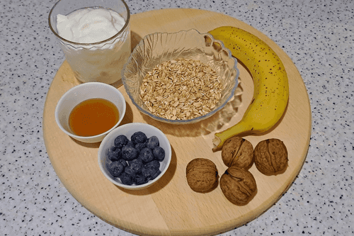 Ленивая овсянка с бананом, йогуртом и медом — это истинное воплощение утренней заботы о себе. Этот рецепт берет свое начало в европейской кухне, где ценят полезные и быстрые блюда. Овсяные хлопья, настоянные в нежном йогурте, приобретают приятную кремовую текстуру, а сладость банана и меда делает вкус мягким и насыщенным. Грецкие орехи добавляют хрустящую нотку, а голубика приносит свежесть и легкую кислинку. Это идеальный завтрак для тех, кто ценит полезность без лишних усилий: готовится с вечера, а утром остается только наслаждаться. Ленивая овсянка отлично подойдет как для легкого перекуса, так и для полноценного завтрака, заряжая энергией и даря удовольствие от вкуса.