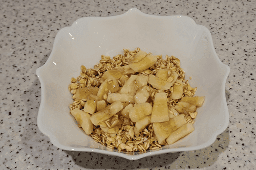 Грецкие орехи очистить, мелко нарезать, выложить в емкость к овсянке и банану.
