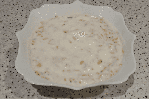 Выложить в емкость к овсянке, банану и орехам 200 грамм йогурта.