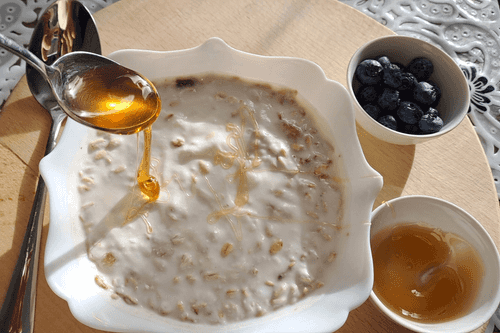 Выложить в емкость с готовой овсянкой 1 чайную ложку меда.