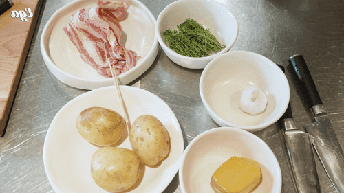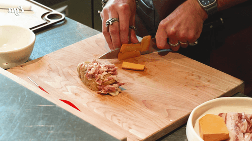 Вложить сыр и бекон в надрезы готовой картошки поочередно.