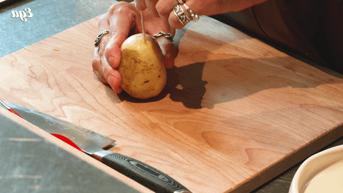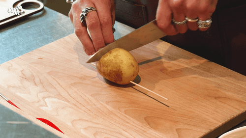 Поставить картошку срезом вниз и сделать глубокие надрезы прямо до самой шпажки с шагом в 2–3 мм. Затем вынуть шпажку, она больше не нужна.