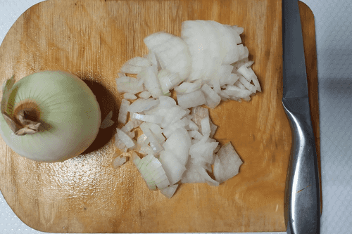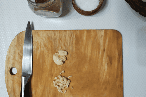 Зубчики чеснока раздавить ножом и мелко нарезать.