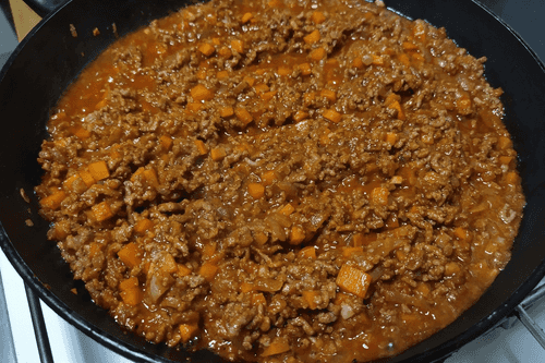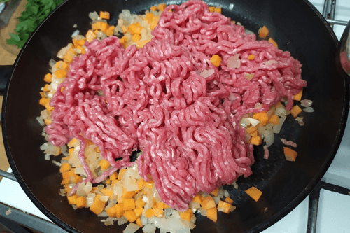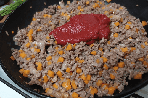 Когда фарш почти готов, добавить томатную пасту. Также обжарить в течение 2–3 минут.