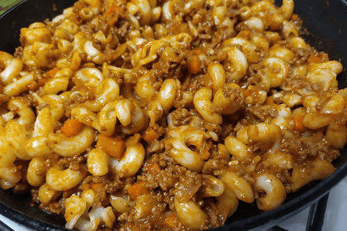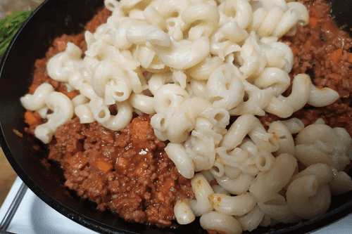 Добавить к фаршу предварительно отваренные макароны, тщательно перемешать и прогреть на сковороде еще несколько минут.