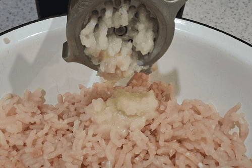Чеснок очистить, хорошо вымыть под проточной водой, выдавить через пресс в емкость к рыбному фаршу и луку.