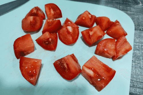 Крупно нарезать помидоры.