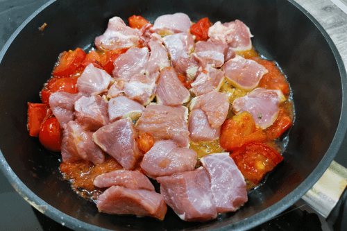Выложить индейку на сковороду. Обжаривать на сильном огне.