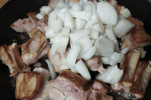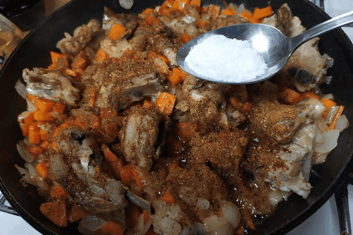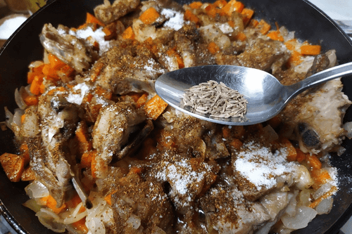 Добавить кумин (зиру). Перемешать мясо со специями и обжаривать еще 1–2 минуты.