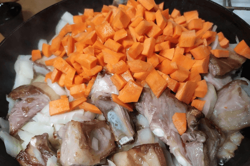 Затем засыпать морковь. Уменьшить огонь, обжаривать овощи с мясом в течение 5–7 минут, периодически помешивая.