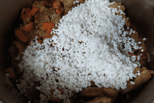 Рис хорошо промыть несколько раз (до момента, пока вода не будет прозрачной). Выложить и разровнять промытую крупу слоем сверху над мясом (не перемешивать!).