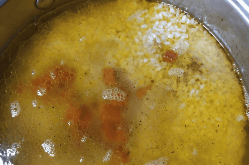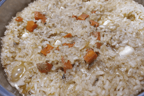 Аккуратно влить 2 стакана горячей кипяченой воды. Вода должна покрыть слой риса на 1–1,5 см. Готовить на медленном огне без крышки до выкипания жидкости и готовности риса.