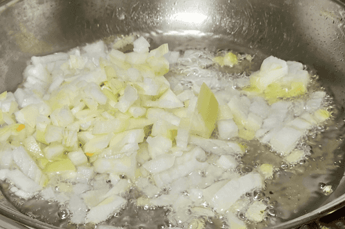 Разогреть масло в сковороде и положить лук обжариваться.