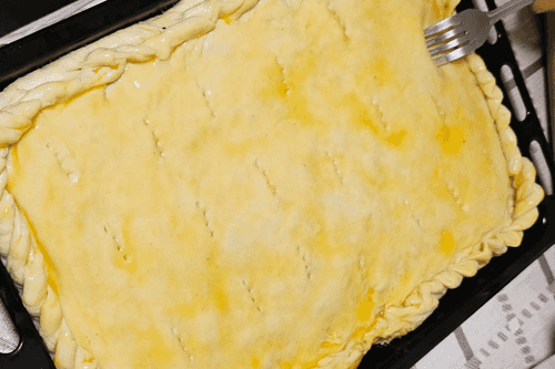 Выложить второй слой теста и залепить края. Смазать пирог желтком и сделать вилкой проколы верхнего слоя теста. Дать пирогу подойти 10 минут и убрать в духовку, разогретую до 180 градусов, на 35–40 минут.