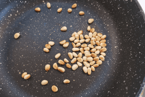 На сухой раскаленной сковороде обжарить кедровые орешки в течение 3 минут.