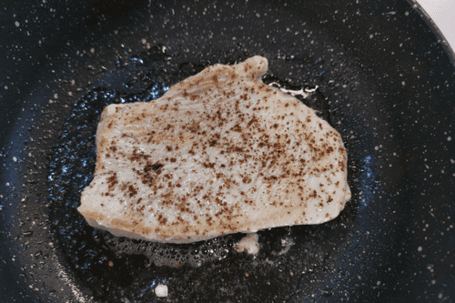 Перевернуть стейк и приправить перцем. Убавить огонь.