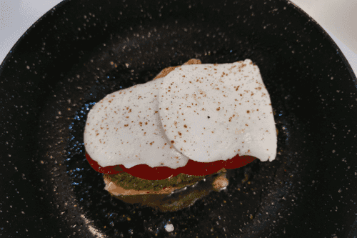 Затем выложить слайсы моцареллы. Приправить черным перцем.
