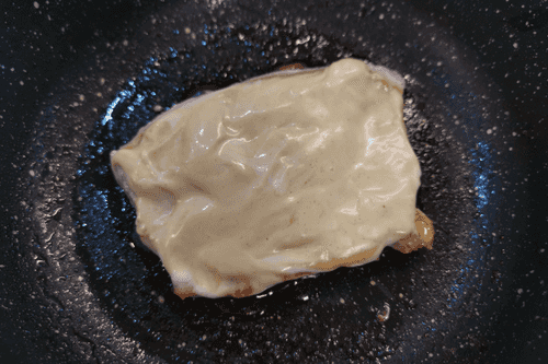 Смазать стейк горчицей и майонезом.