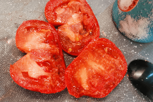 Помидор тонко слайсировать и посолить.