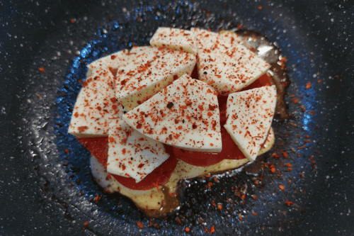 Выложить нарезанный тонкими слайсами сыр и приправить чили.