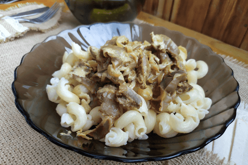 Подавать с гарниром в виде отварных макарон или картофельного пюре.