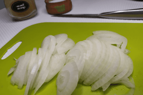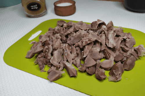 Отварные желудки нарезать вдоль тонкими ломтиками.