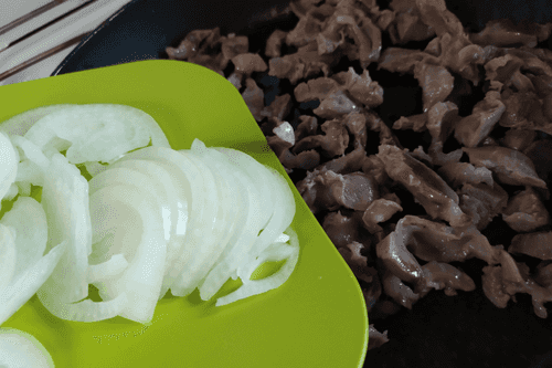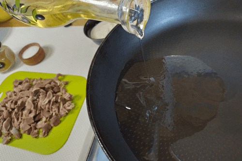 Разогреть на сковороде растительное масло и обжарить мясо в течение 2 минут.