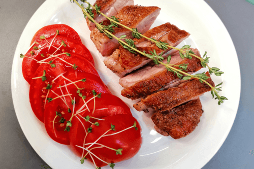 Готовую утку по желанию можно нарезать слайсами. Добавить слайсированный помидор, украсить тимьяном и микрозеленью. Блюдо готово.
