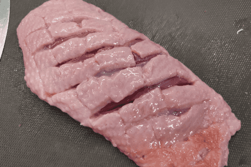 Надрезать кожу на утиной грудке наискосок по всему периметру.