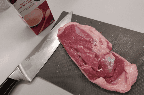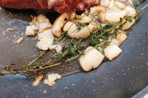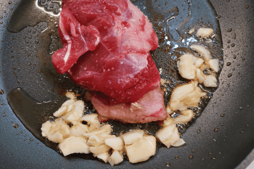 Раздавить чеснок ножом и добавить его в вытопившийся жир.