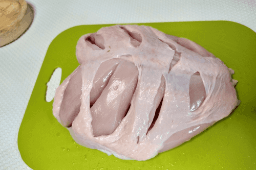 Куриную грудку промыть, обсушить бумажным полотенцем и сделать по три-четыре глубоких надреза до кости с каждой стороны.