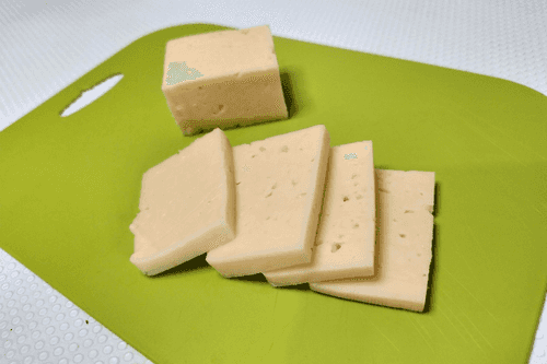Сыр нарезать небольшими пластинами шириной 5–7 мм.
