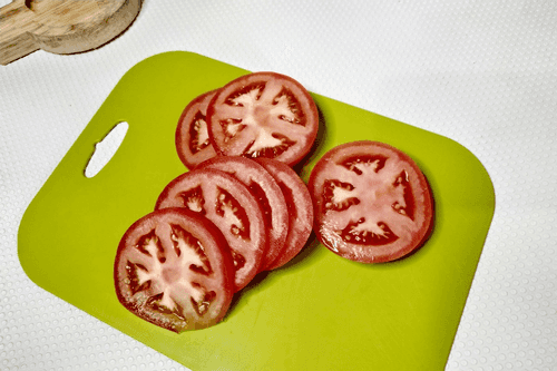 Помидоры нарезать кружочками также шириной 5–7 мм.
