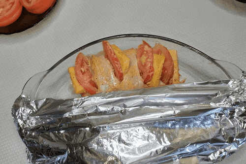 Уложить грудку в глубокое блюдо для запекания и в каждый надрез поместить по одному кусочку помидора и сыра.