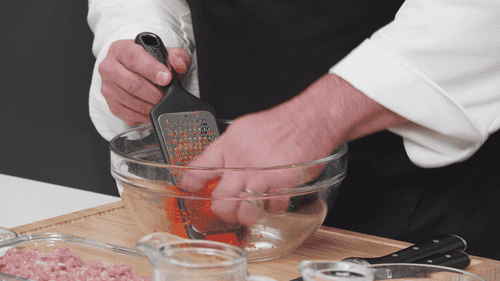 Морковь натереть на мелкой терке, добавить к ней фарш, соль и размоченный хлеб, немного его отжав. Хорошо перемешать.