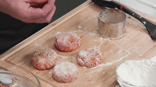 Фарш разделить на порции, обвалять каждую в муке и сформовать котлеты.