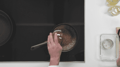 В сотейник с луком добавить гречку и обжарить ее в течение 1 минуты.