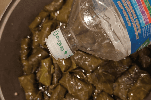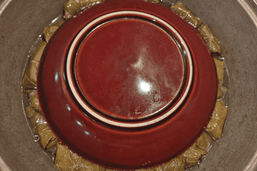 Залить водой так, чтобы от верхнего слоя долмы осталось 2–3 см.