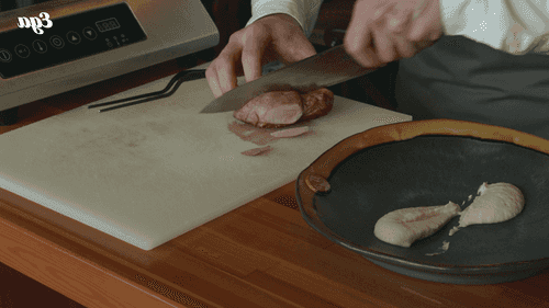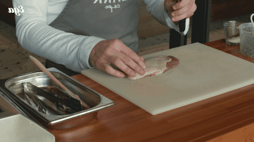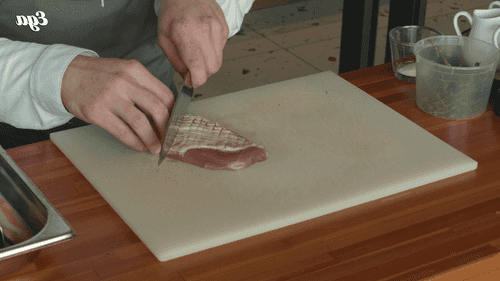 Утиное филе выложить на доску кожей вверх и сделать на коже (не прорезая мяса) частые перпендикулярные насечки.